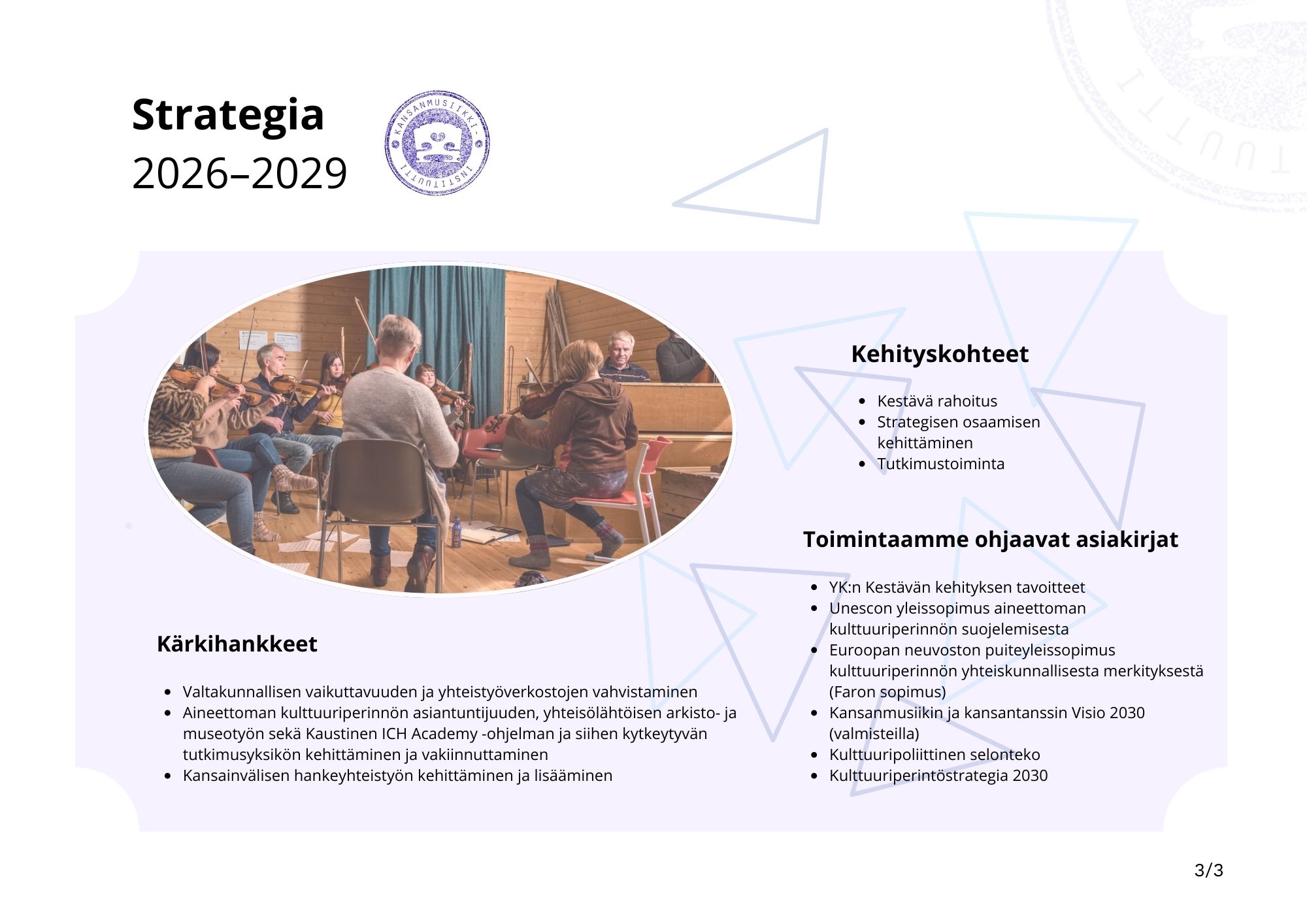 - Aineettoman kulttuuriperinnön asiantuntijuuden, yhteisölähtöisen arkisto- ja museotyön sekä Kaustinen ICH Academy -ohjelman ja siihen kytkeytyvän tutkimusyksikön kehittäminen ja vakiinnuttaminen